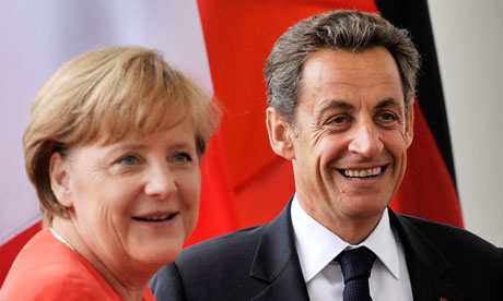 German chancellor Angela Merkel and French president Nicolas Sarkozy arrive at the talks over the Greek debt crisis in Berlin. Photograph: Getty Images